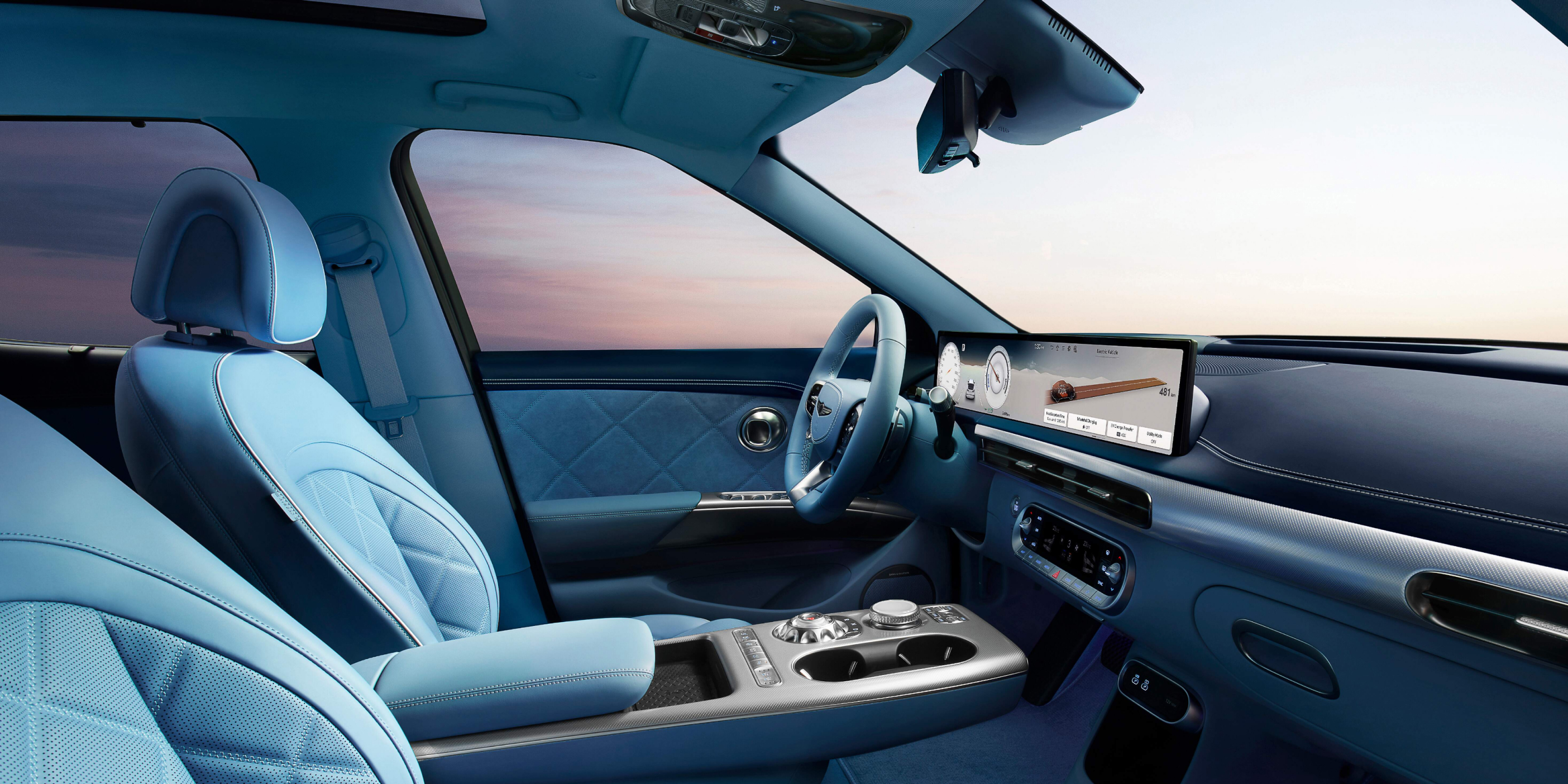 A luxury 17-speaker Bang & Olufsen sound system custom-designed for the GV60 provides rich, high-quality sound. With a tap of their finger, drivers and passengers can choose a sound mix for specific atmospheres.